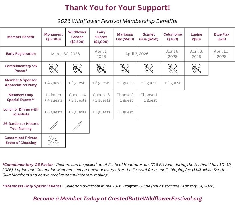 As we look ahead to the 2026 Crested Butte Wildflower Festival (July 10-19), we want to take a moment to express our heartfelt gratitude for your past support. Your membership is not just a ticket to our vibrant events; it is a vital contribution to the flourishing community we cherish. Would you consider becoming a member or renewing your membership in 2026?